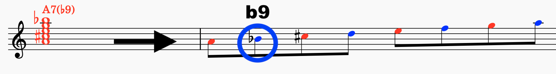 ここでポイントとなるのは、5小節目のA7の部分、僕はフラット9(b9)を付け足しています。リードシートや一般に販売されている譜面にはb9が書いていなかったりしますが、僕はあちこちのドミナント7(いわゆるセブンスコード)にb9を付けるよう生徒さんにお教えしてます。もちろんつけなくてもよいのですが、練習のため!脳内を活性させるためです!(本当は別の理由が沢山ありますが、とりあえずユルい理由で大丈夫だ〜〜www)