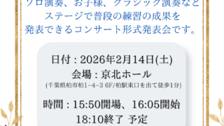 ソロ演奏、お子様、クラシック演奏などステージで普段の練習の成果を発表できるコンサート形式の発表会です。柏駅すぐそば、ドイツ・Bechstein社のグランドピアノのある素敵なホール、京北ホールで行います。どなたでもご見学いただけます。入場無料...