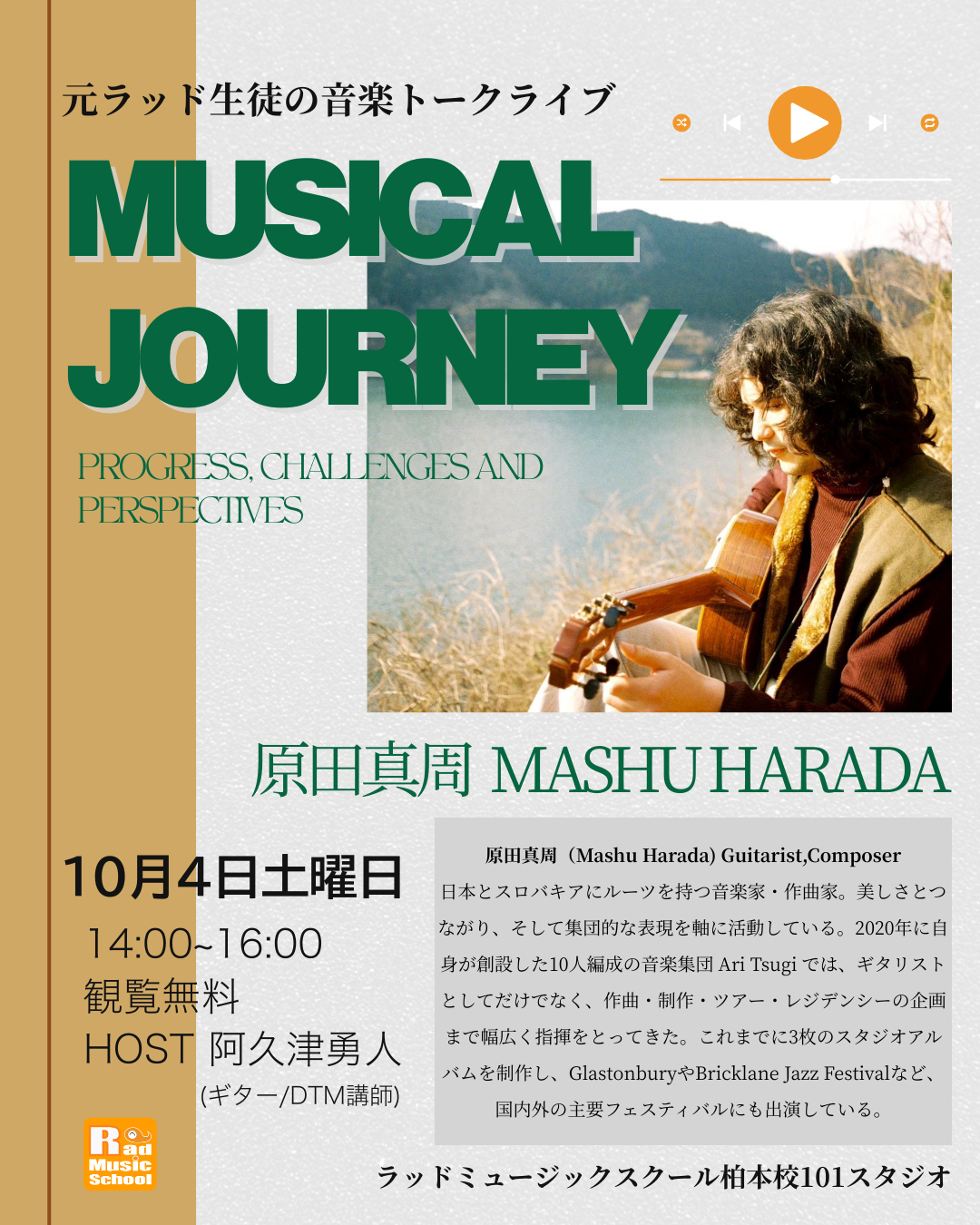観覧無料!ミュージシャンとして活躍しているラッドミュージックスクールの元生徒さんが現在の音楽活動やそこまでの道のりなどを、ギター/DTM講師の阿久津先生と一緒に気楽に話してくれたりちょっとした演奏もしてくれるトークライブです!